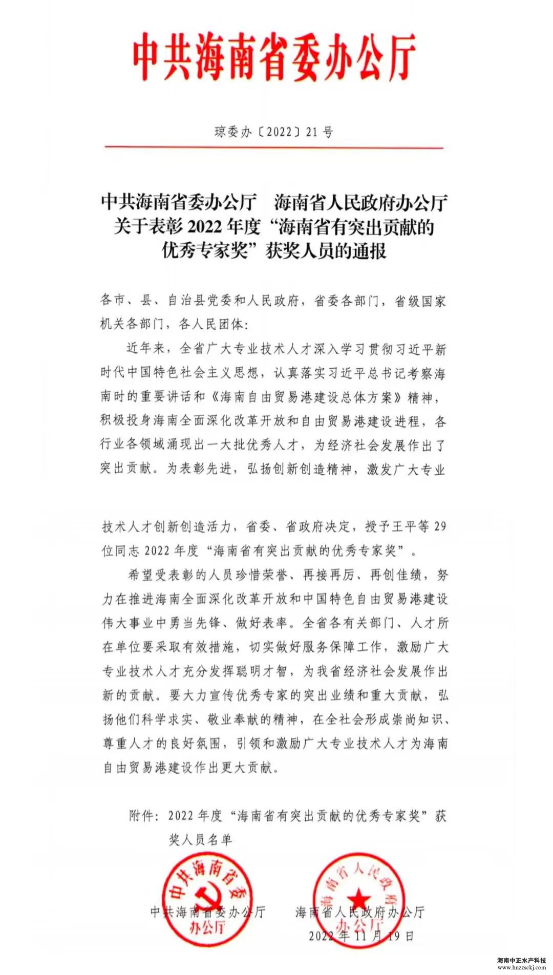 其中,海南中正水產(chǎn)科技有限公司副總裁王平同志榮獲“海南省有突出貢獻(xiàn)的優(yōu)秀專(zhuān)家獎(jiǎng)”表彰。