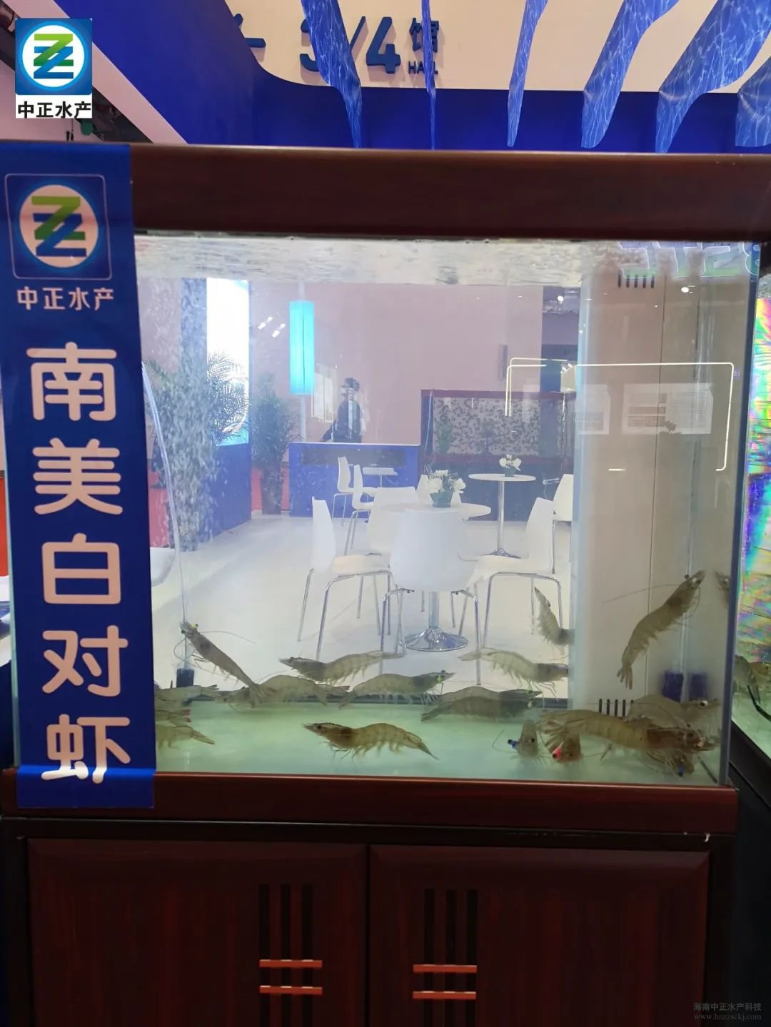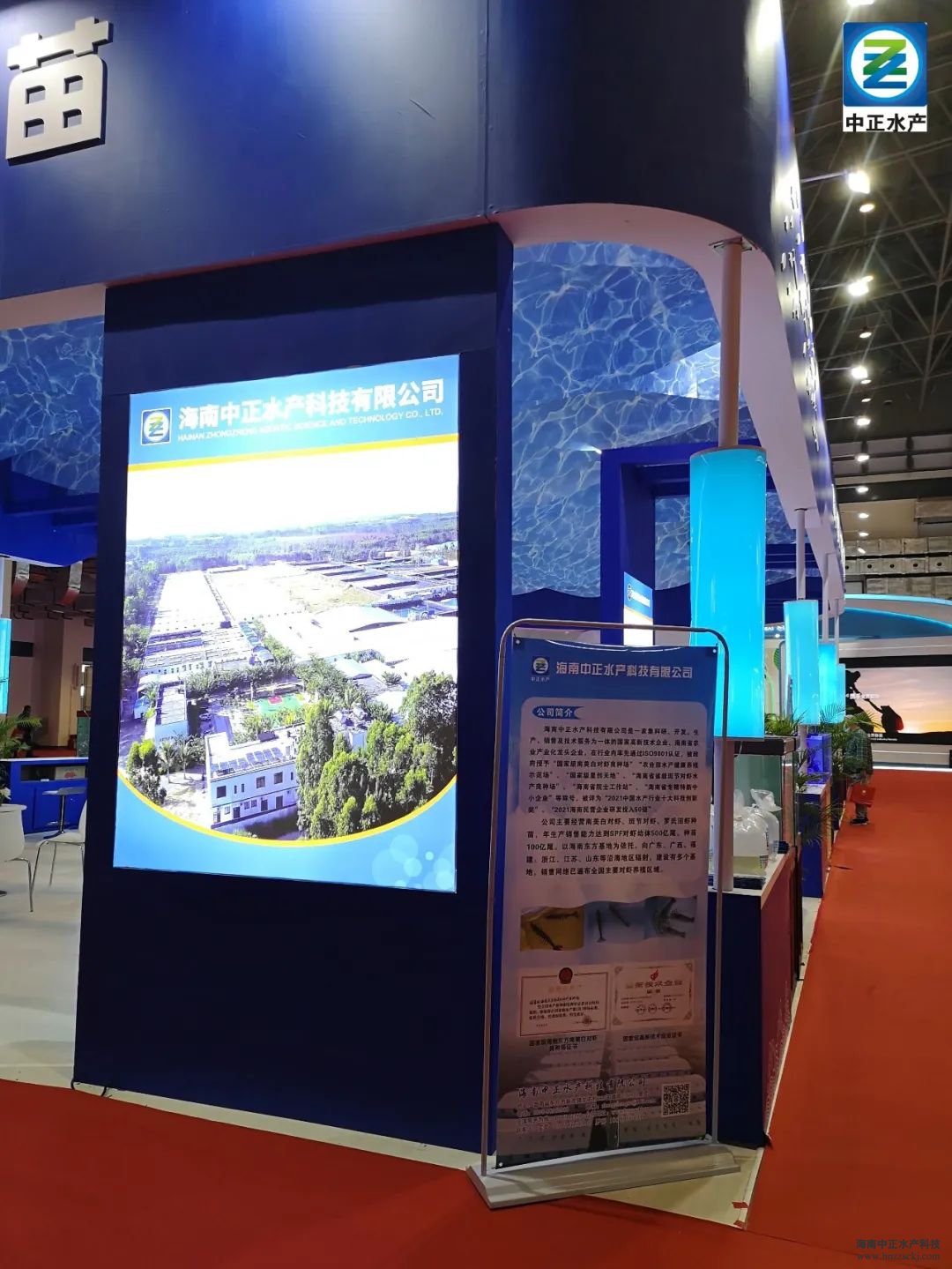 海南中正水產代表東方市特色農業企業及現代水產種業企業參展,分別在科技強農館海南漁業種苗區、鄉村振興館東方館展出自主繁育的南美白對蝦親蝦、羅氏沼蝦親蝦以及南美白對蝦蝦苗。