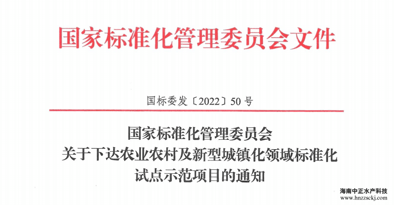 近日,國家標準化管理委員會發布關于下達農業農村及新型城鎮化領域標準化試點示范項目的通知,在第十一批國家農業標準化示范區項目中,中正水產作為海南省唯一一家企業,成功入選第十一批國家農業標準化示范區項目。