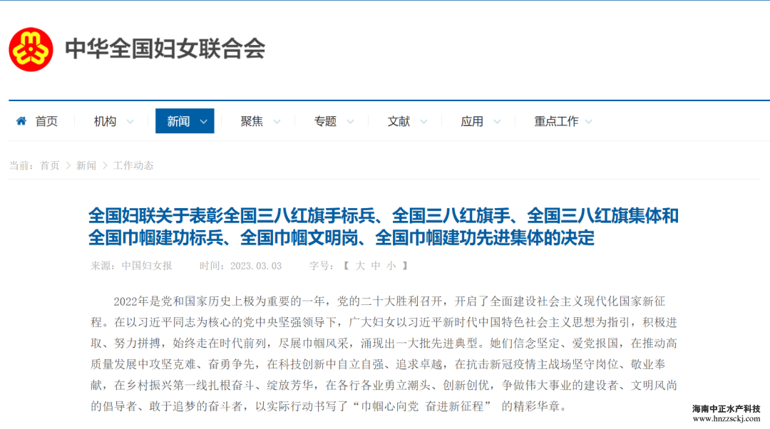 為表彰先進(jìn)、樹立榜樣,3月3日,全國(guó)婦聯(lián)表彰了10名全國(guó)三八紅旗手標(biāo)兵、298名全國(guó)三八紅旗手、199個(gè)全國(guó)三八紅旗集體、1992個(gè)全國(guó)巾幗文明崗、996名全國(guó)巾幗建功標(biāo)兵、500個(gè)全國(guó)巾幗建功先進(jìn)集體。其中,海南中正水產(chǎn)科技有限公司研發(fā)中心被授予全國(guó)巾幗建功先進(jìn)集體。