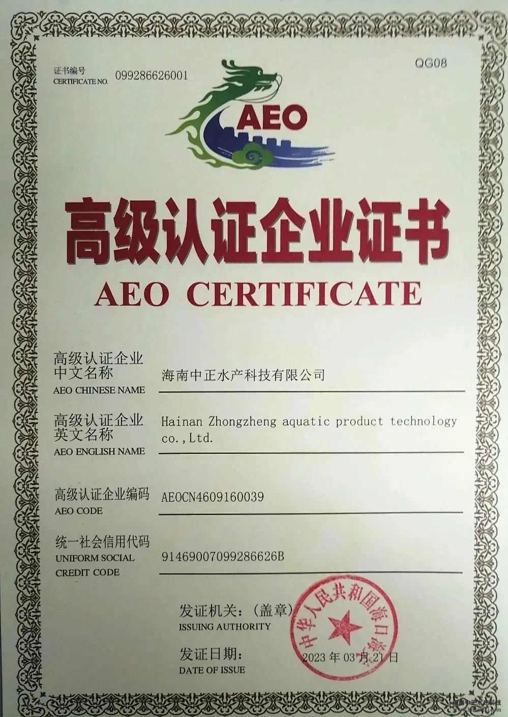 海南中正水產科技有限公司于2023年3月獲批成為海關AEO高級認證企業,成為海南省首家水產種業進出口為主的AEO認證企業。